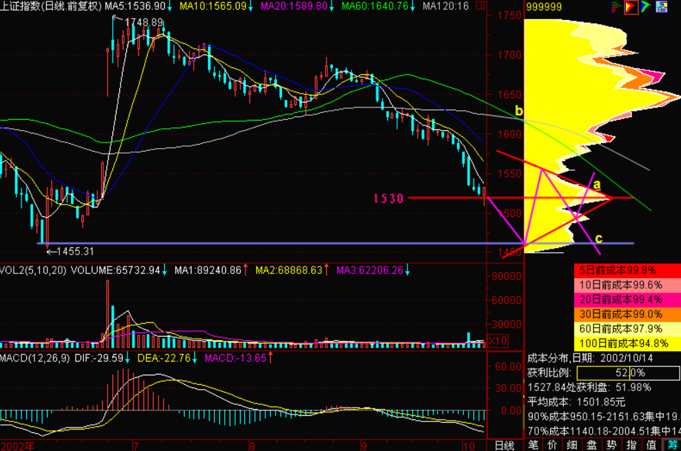 经过这么科学地分析以后,我们估计从c点向下突破原来的低点创新低,这只是时间问题,这种趋势是存在的,而且这一轮反弹造成的麻烦是什么呢?就是1530点这个区间又堆积了一堆套牢筹码,指数以后再要回上来,又会比较麻烦。