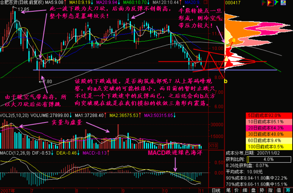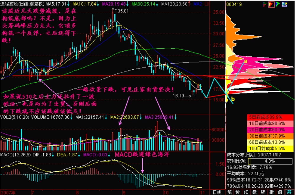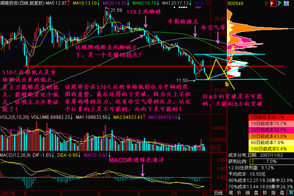 小结:【下跌不言底】,只要股价从120下小平台向下突破,则头顶压力重重,就算主力有心要做该股,起码也得跌上一段时间,等待头部的套牢盘割肉之后才行,而绝大部分情况下,对于刚构筑了头部的股票,一旦向下突破之后要马上翻身向上,这是不可能的!
