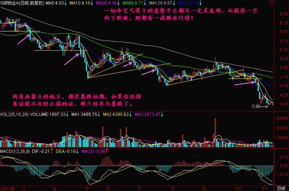 大家以后要记住了,在【冷空气带】下面,如果有小平台盘整不要乐观,这不是底部,相反很容易发生向下巨量跳空,快速下跌。这是我们炒股十几年总结出来的一个惨痛教训,是输了很多很多钱才体悟出来的。对这类走势,你要避免风险就记住一句话:【我们不做2-3】。有人说,我已经呆在里面了怎么办?【冷空气带】下面的小平台前底部被打穿时,就要引起警惕,这个地方十有八九是要暴跌的,这是最后的末班车,否则一旦跳空下来,你就很被动了。