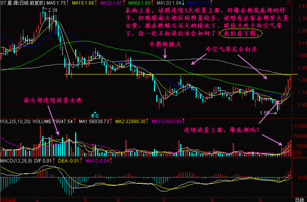 小结:之所以会形成冷空气带,那是由于股价长期上涨后庄家在高位出货所致,而一个庄家刚出货不久的股票,K线一旦在冷空气带下面,则是跌易涨难,不下跌一定的空间,不持续一定的时间,庄家是不会回来的,所以你待在冷空气带下面是完全没有必要的。