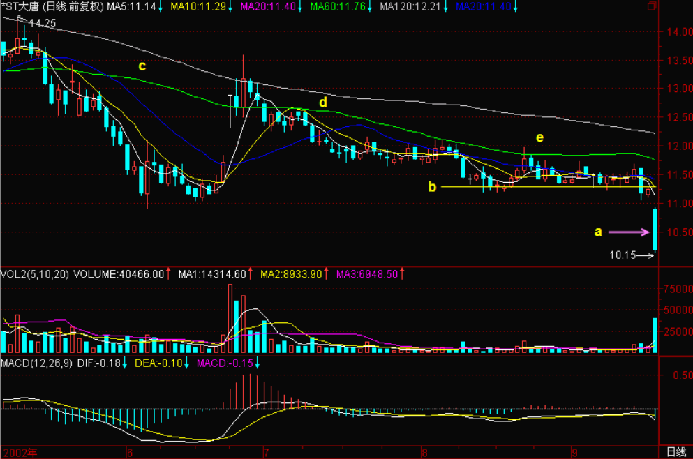 图中a所指处发生了暴跌,跳空放量下跌,跌了9.42%,对于这种跌势,有的同学就不理解了,为什么这里会发生暴跌?为什么在当时指数仅跌了10个点的情况下,它却跌了9.42%?表面上看起来,这个股票前期有一些止跌,似乎是在b横线处构筑底部,其实这是一个错觉。