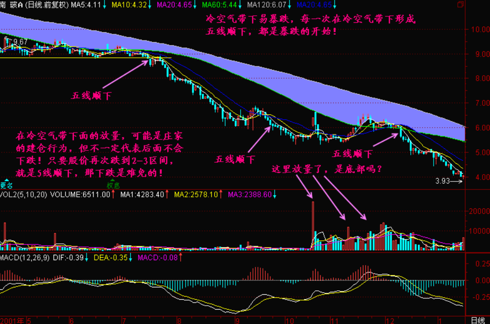 也许有人又要问了,那么照你的说法,在冷空气带下都容易暴跌,就没完没了了吗?没有底了吗?当然不是的,底部特征不是已经在前面有过作业了吗?这里不再重复,这里我们就是要让你明白冷空气带下不要持股的重要性!