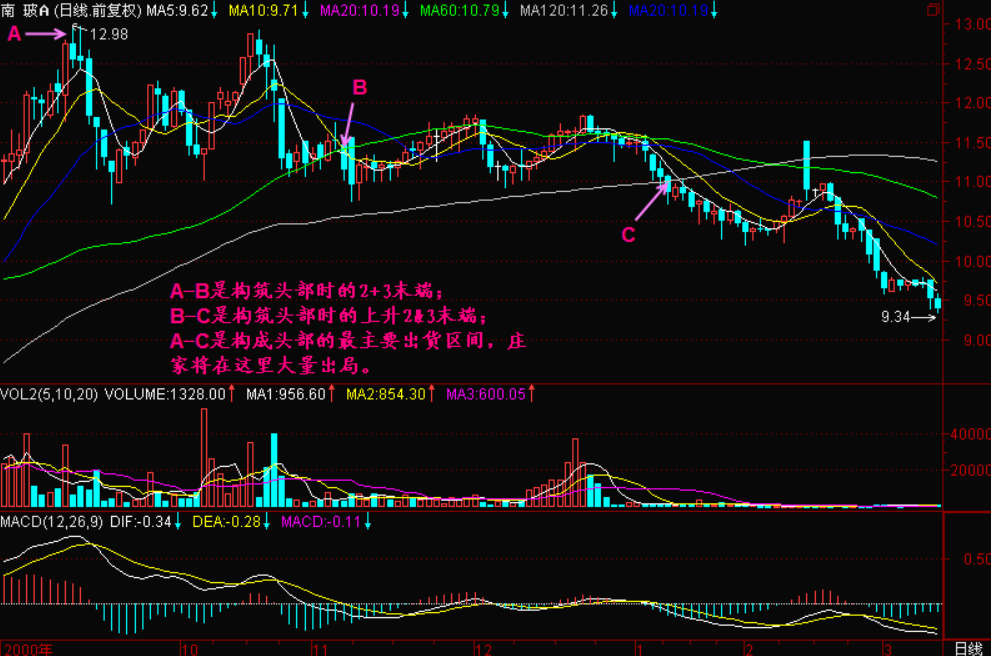 而在这个区间中又分成两段:第一段是“A”所指到“B”所指,这里属于2+3区间。不要以为2+3就是赚钱的天堂,其实只有在2+3图形的初期才是比较稳定的赚钱区间(所谓比较稳定是指还有意外,有些2+3初期因各种突发事件也会出现亏损),在2+3的中期和末期,其操作风险会越来越大。图中“A”所指到“B”所指就是2+3的末端,也就是风险最大的区间;第二段是“B”所指到“C”所指,也就是2&3区间。这里是要跌不跌的区间(2&3区间有两种状态,在头部时表现为要跌不跌,但最终还是跌;在底部表现为要涨不涨,但最终还是涨),对这个区间没有充分的认识,那么就将错过这个要跌不跌的出货机会。见(图124-1)所示。