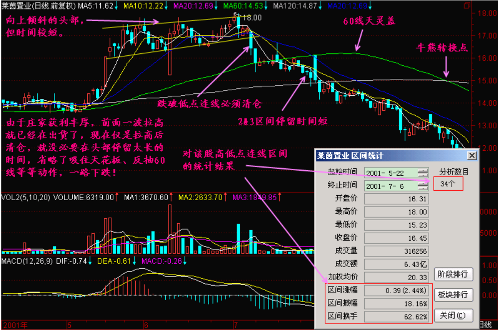 通过统计上面股票得到如下信息:时间段42个交易日,这就是2&3的时间区间。从“根数”上可知该区间有42根K线,也就是有42个交易日,这么长的时间你不跑能怨谁呢?你想知道庄家在这段时间内逃掉了多少筹码?请看换手率27.76%,也就是说这段时间内如果都是庄家出货的话,他能出27%,当然这是不可能的,其中定有小部分散户在其中撤退,显然这些散户是掌握2&3出货技术的。其实庄家的出货时间不仅仅是2&3区间,还有2+3区间以及2-3区间。总之,占有主动权的庄家无论如何要把手上的货都卖出,该股的头部才算构筑完成。