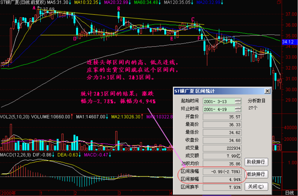 如果庄家把这个空间控制在10%到20%的范围内,股价快速上升和下跌就像过山车那样颠簸,那会吓跑多少散户。所以在高空作业中,庄家要求的是稳定压倒一切。那么在收盘价基本稳定的前提下,庄家能不能做点小动作,比如说盘中某一瞬间拉高一下股价,见到有人跟风时快速向下卖出,从而形成盘中瞬间高低点?几乎所有的庄家都会玩这个动作,在"指定区间统计"中可以看到这个区间的最低价34.62元(复权后的价格),最高价36.33元,震幅4.94%,这就是最高价格和最低价格的震荡幅度。尽管比收盘价计算的涨跌幅稍大一些,但能控制在5%之内,其震幅还是小的,可见银广夏的庄家操盘技巧尚高。