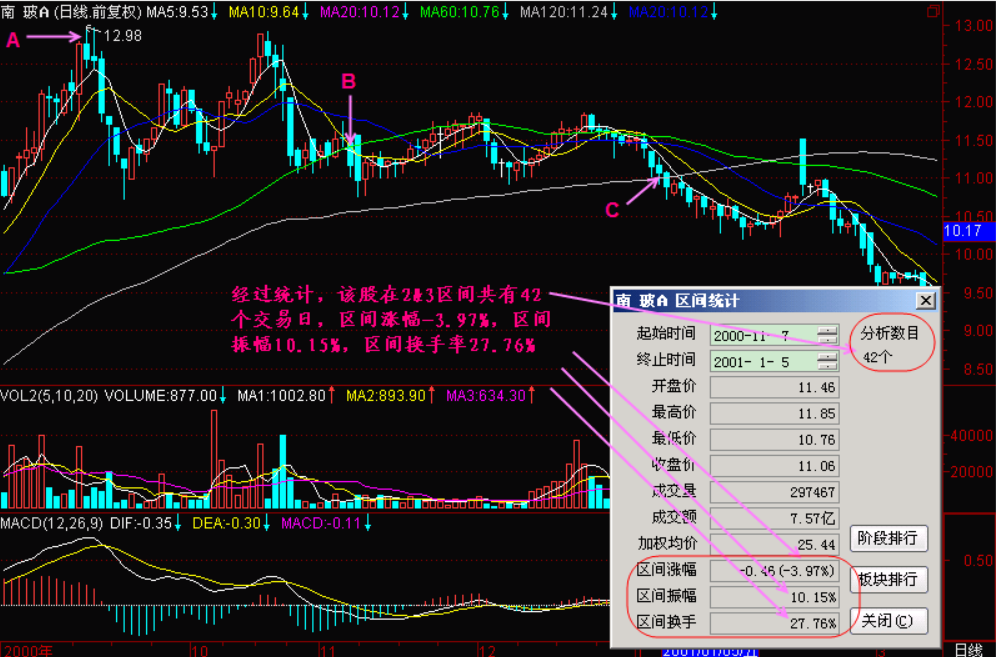 A所指的收盘价和B所指的收盘价构成的直线(我们称高点连线),以及C所指的收盘价和D所指的收盘价连成的直线(我们称低点连线),在这两条连线之间就是高空间的出货区间。同样它也分成两段:第一段分布在2+3区间,第二段分布在2&3区间。在这里我们只统计2&3区间,从“区间统计”窗口上看到:以收盘价计算的涨跌幅仅仅跌去了2.78%,这么小的跌幅给人的感觉是股价在横向盘整,盘整完还会向上突破。