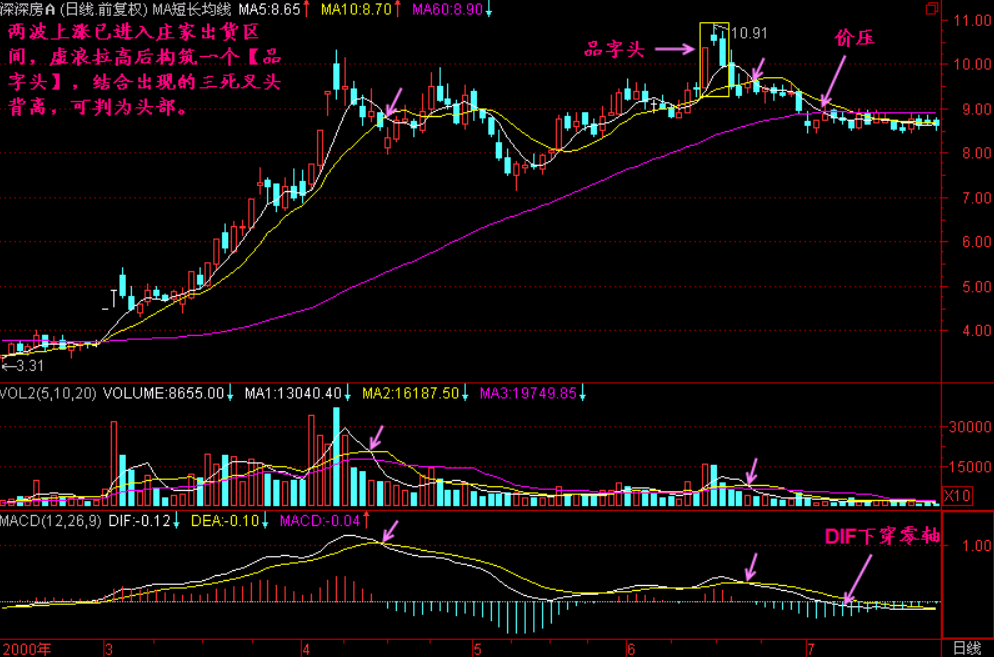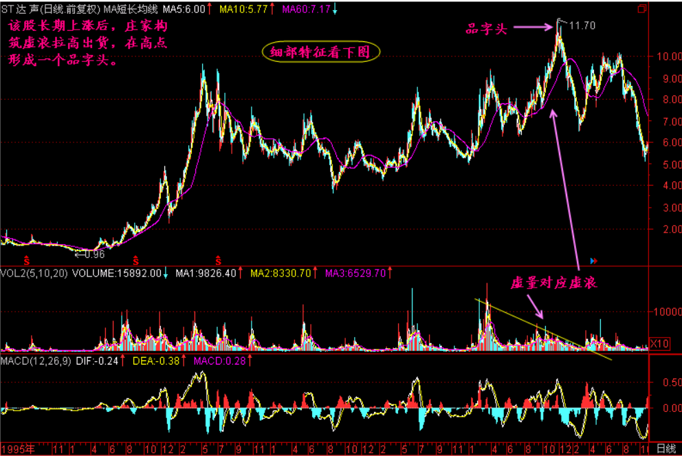 小结:【品字头】是对股价头部最高价的形象描绘,就是阶梯形上升——阶梯形下降的走势,犹如“品”字。