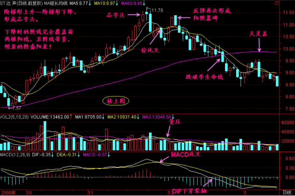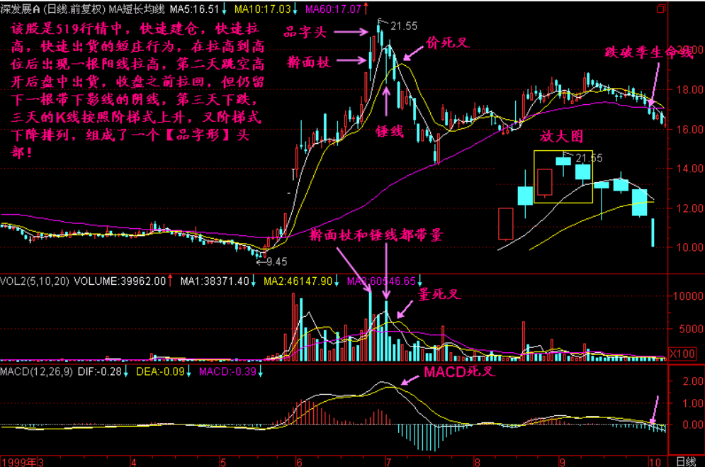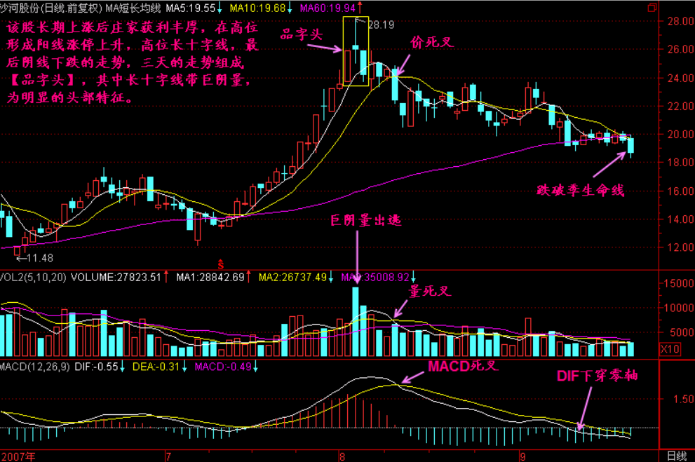 如果【品字头】带量,那么就更加重了形成头部的可能性,可结合三死叉见顶、跌破季生命线等头部特征一同研判。