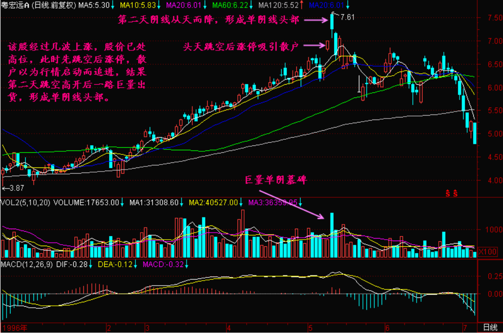 一根阴线的头部出现后,未来几天股价往往低价运行。套牢者很难平手出局,没有悔改的机会;