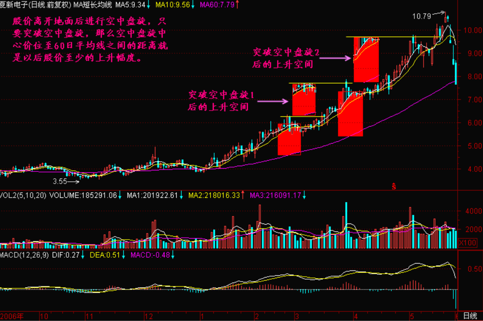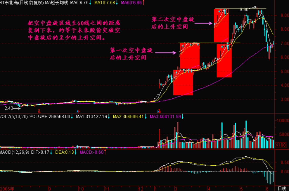 【空中盘旋】是股价在离开地面以后的一次洗盘行为,在股价经过【空中盘旋】后的上扬空间,大约等于【空中盘旋】这个盘整带的中心价位至60日均价线之间的距离,否则,新一段的涨势如何展开呢?