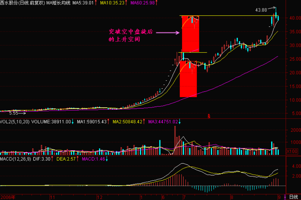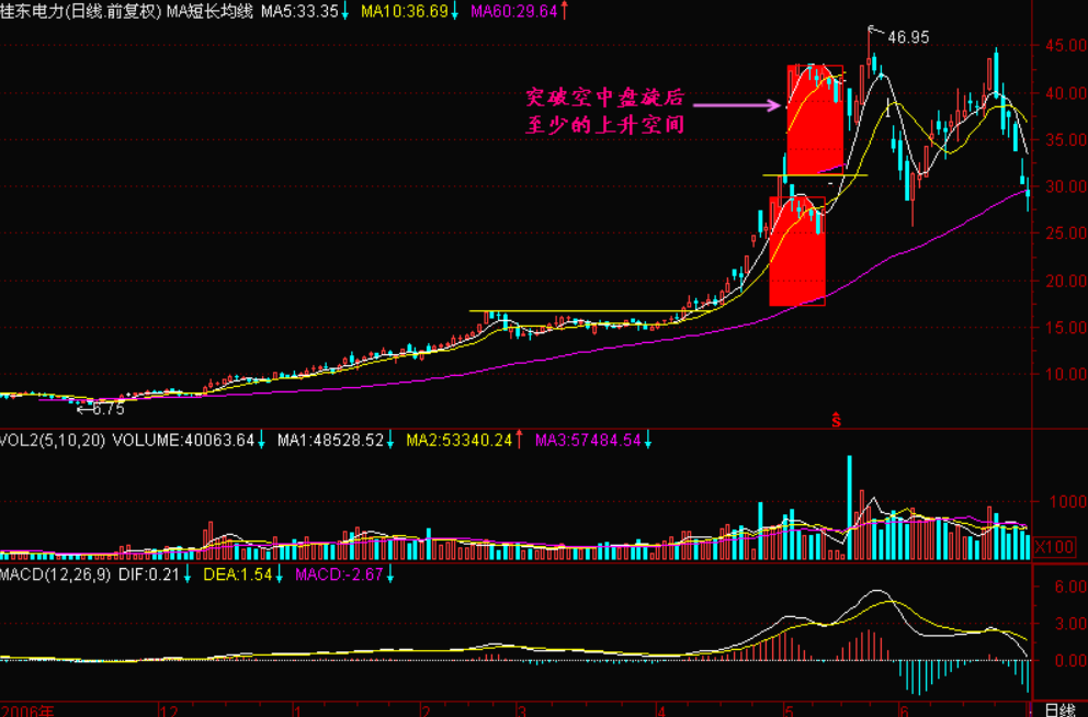 小结:股价在空中盘旋位置的地方为主力洗筹,空中盘旋加油后股价才有继续上升的动力,那么股价在突破空中盘旋最高收盘价后的至少上升空间就是空中盘旋中心价位与60日平均线之间的距离,请注意这个是大概的估测,有时候在突破空中盘旋后涨势较为凌厉,很可能冲过头一些,这并不奇怪,一切都是庄家受拉高期巨大利益的驱动使然。