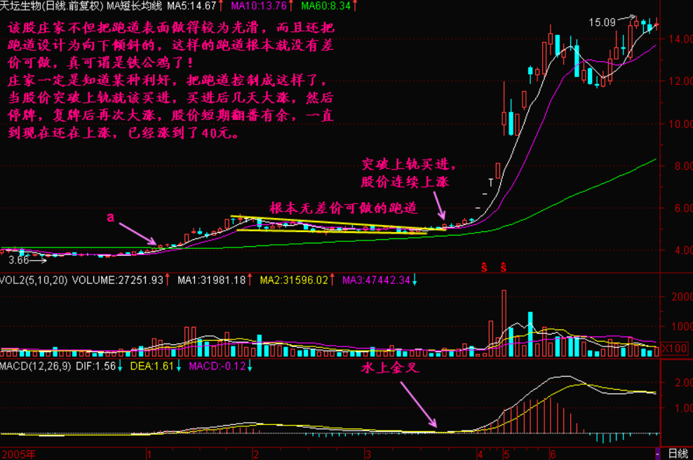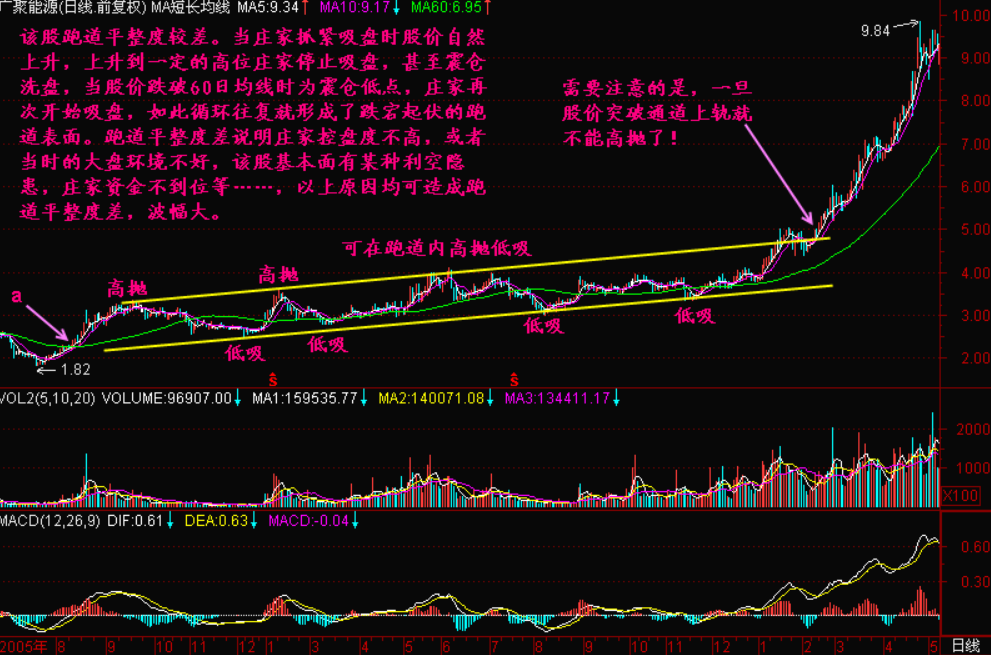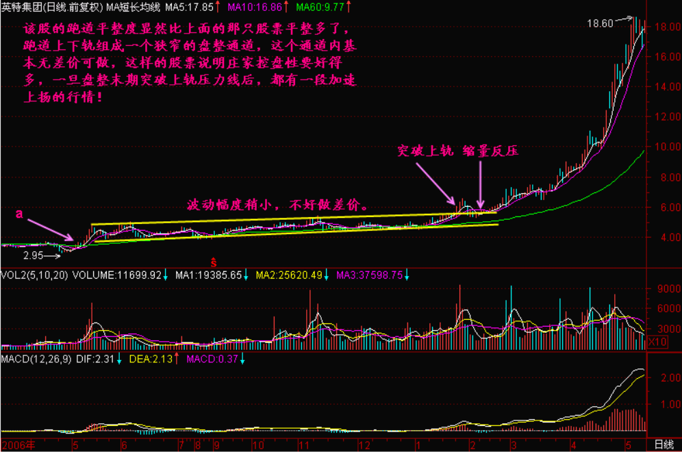 【跑道平整度】不好的个股,在滑跑期间波幅较大,股价高低点之间往往留下了差价可做,这样的股票在没有突破跑道上轨之前尽可以在跑道内做差价,高抛低吸不亦乐乎。但请注意,当股价真的突破上轨之后千万不要犯经验主意的错误而高抛了,这时不但不能高抛,还应该加码追进,股价马上就开始拉升行情了。
