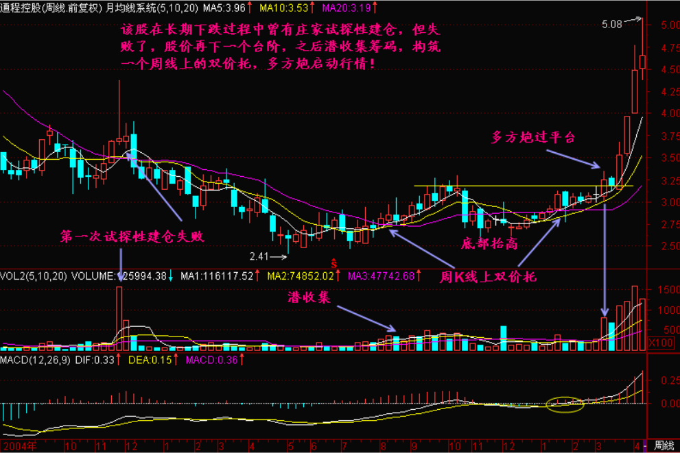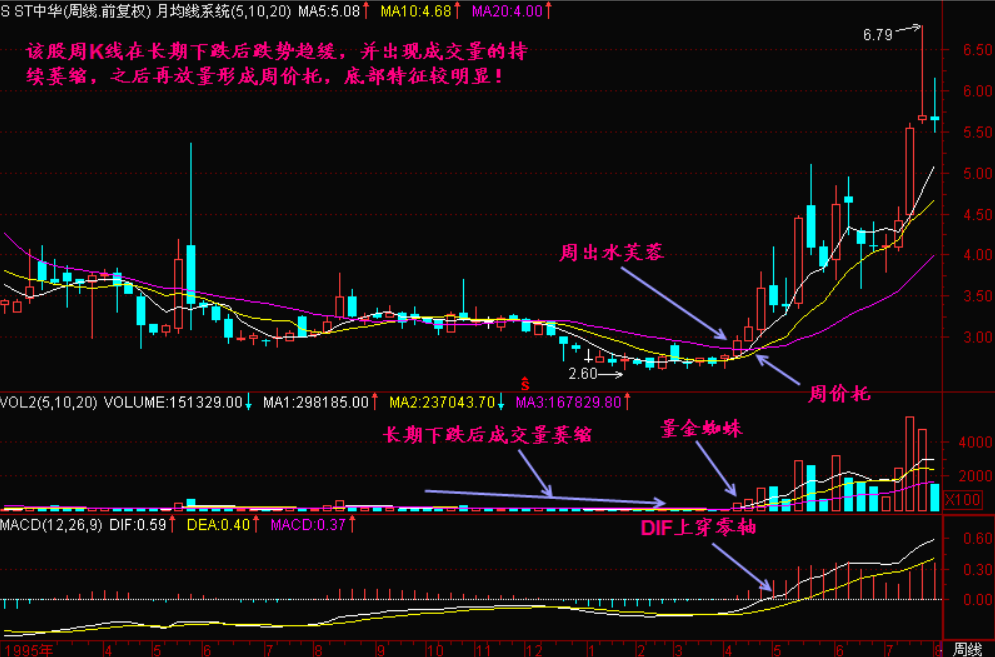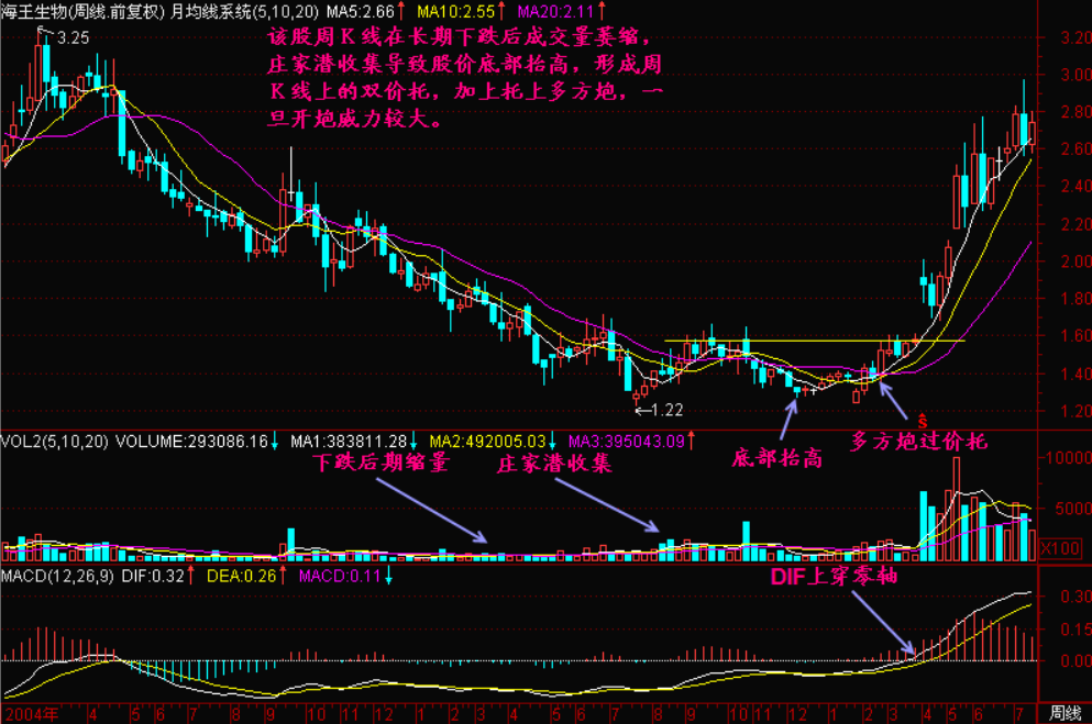 周K线上5周、10周、20周均价线“托”和5周、10周、20周均量线托更有底部确认作用。