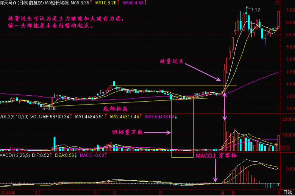 有时是单根巨大阳线,有时是温和放量的几根阳线,总之在冲过前头部时有成交量的配合。