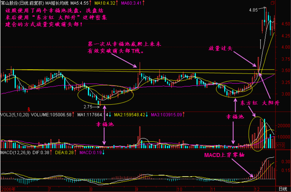 小结:放量过头是比较重要的一课!一只股票的价格要从底部区间向上突破就必须得放量才能证明确实是在突破,否则的话就要多观察,特别对于用“东方红 大阳升”这种密集放量的方式突破前头部的股票更应该引起我们的重视!
