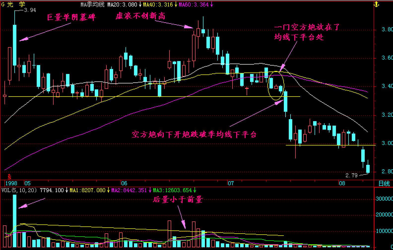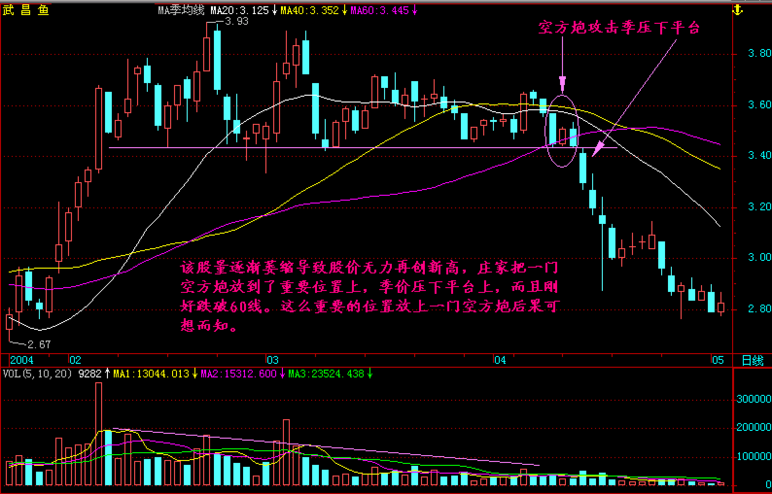 下面还有三门空方炮都是在季均线系统之下跌破平台的,因为头上有季均线强大的向下压力,所以开起炮来显得更有力。