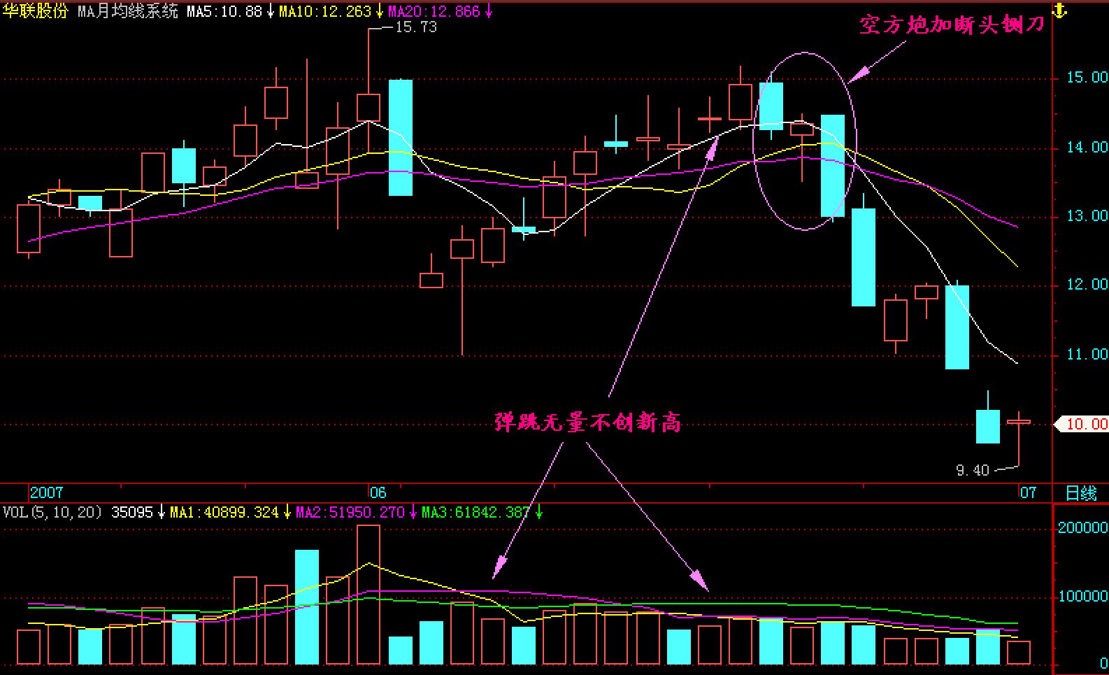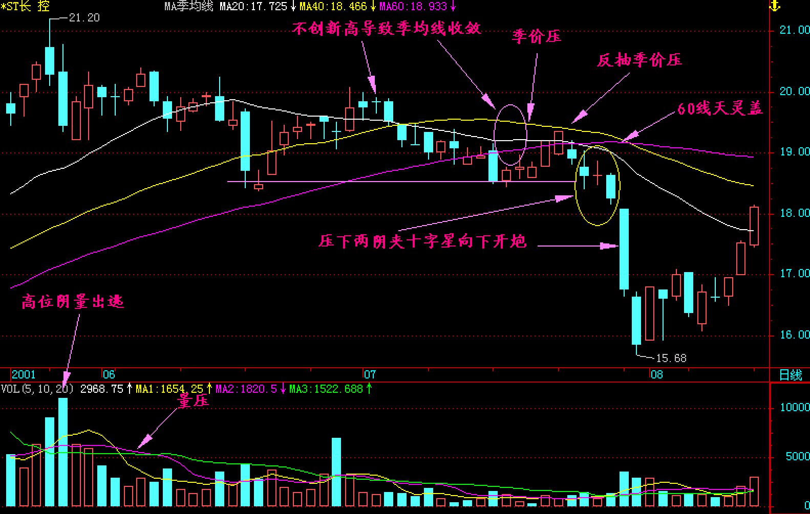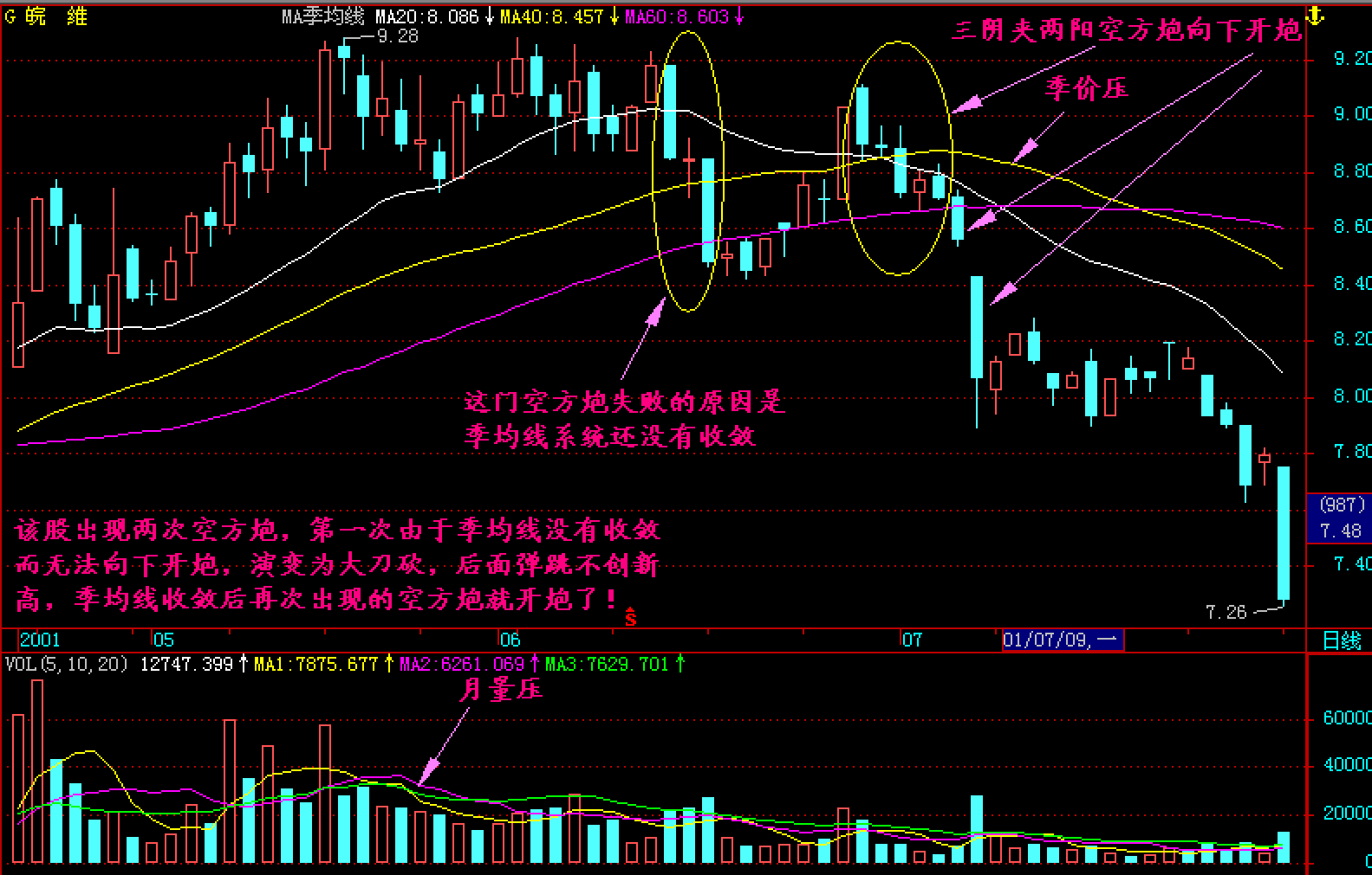 下面这幅图有两门空方炮的对比,其中之一因为季均线系统没有很好的收敛,所以演变成了“大刀砍”,经过弹跳不创新高之后出现的那门空方炮,因为季均线收敛了,就要命了!见(图22-3)