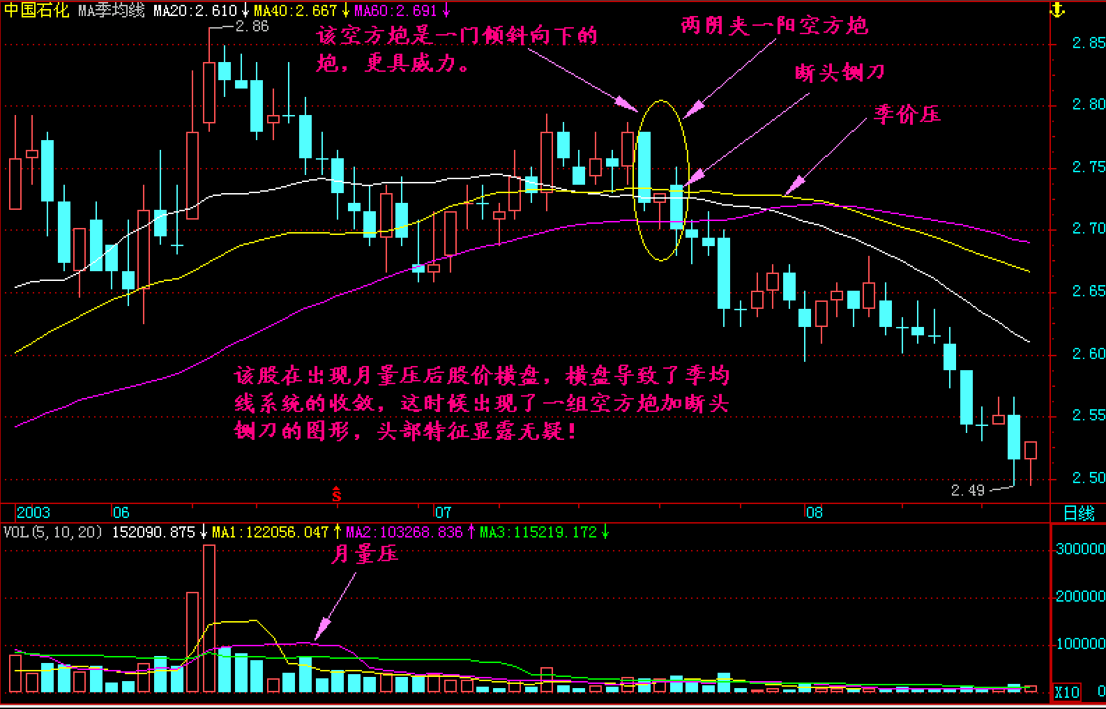 下图是一门季均线系统上的空方炮,空方炮正好出现在季均线收敛之后,第三根阴线又是断头铡刀!见(图22-2)