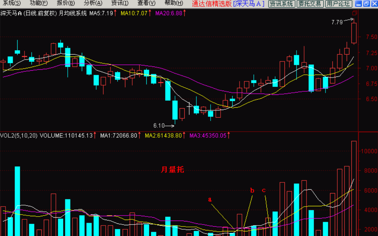 (2)随着股价越来越低使长线客开始进场,于是成交量开始缓慢上升,经过一段时间的成交量温和放大后,5日均量线上穿10日均量线(图2-1)中a线所指的结点,说明市场开始趋于活跃,这将进一步吸引长线客进场,几天之后5日均量线上穿了20日均量线(图2-1)中b线所指的结点,随着成交量的不断放大,10日均量线又上穿了20日均量线(图2-1)中c线所指的结点,三条均量线封闭成一个三角形,这就是“量托”。