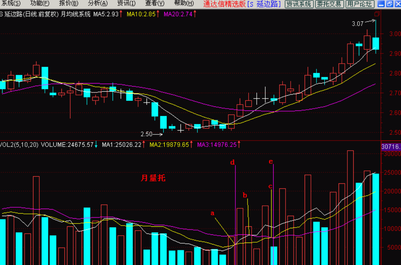 (3)量托形成以后均量线由空头排列彻底转变为多头排列(图2-1)中e线之后,说明此时5日内买进的成交量比10日内和20日内买进的成交量还要大,10日内买进的成交量比20日内买进的成交量还要大,说明成交量正在呈均态上升,也说明市场开始进一步活跃。这种成交量的放大,往往是主力和先知先觉的股民开始入场的结果,在底部区间往往是可靠的买入信号。