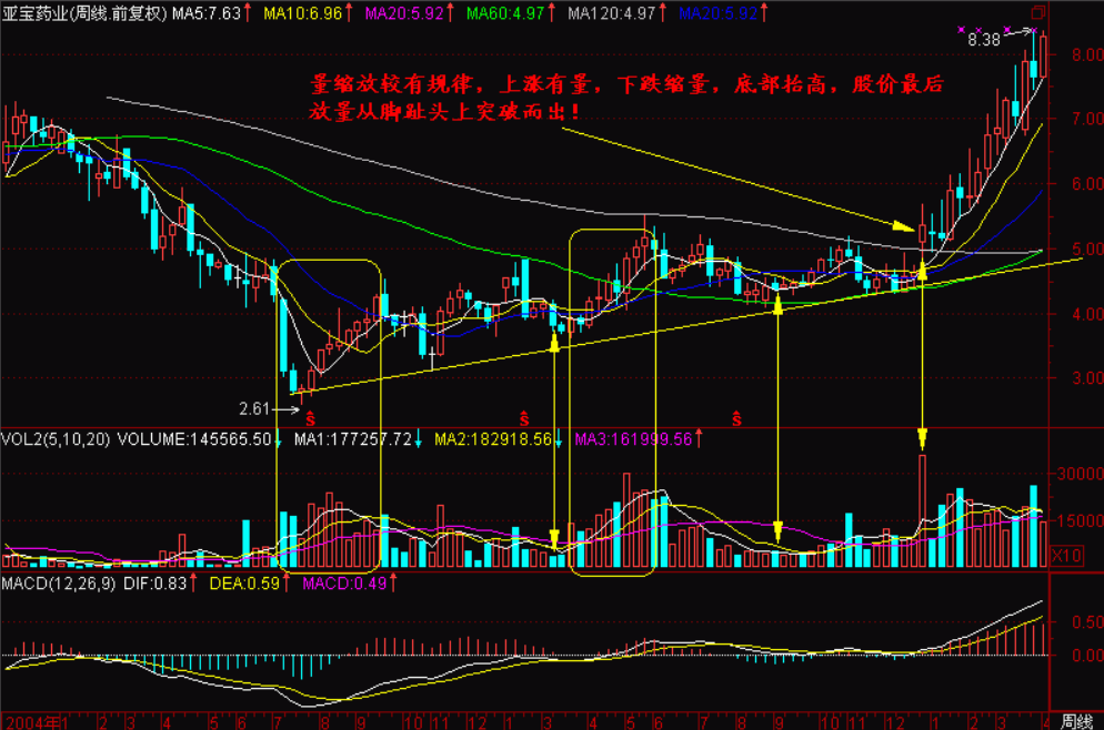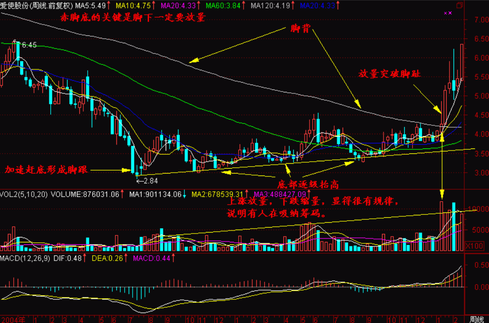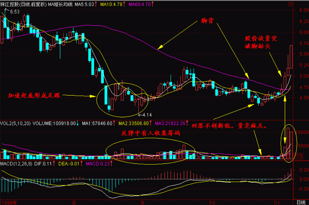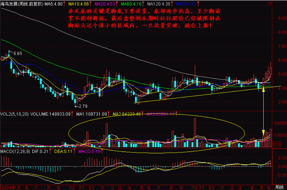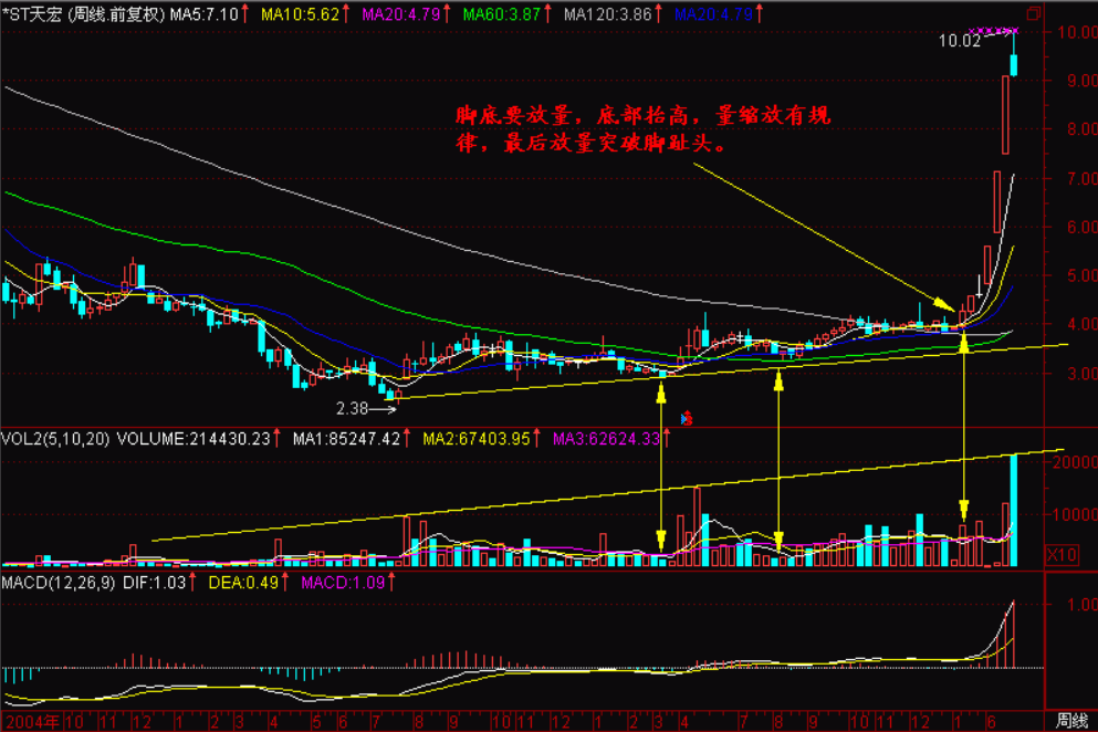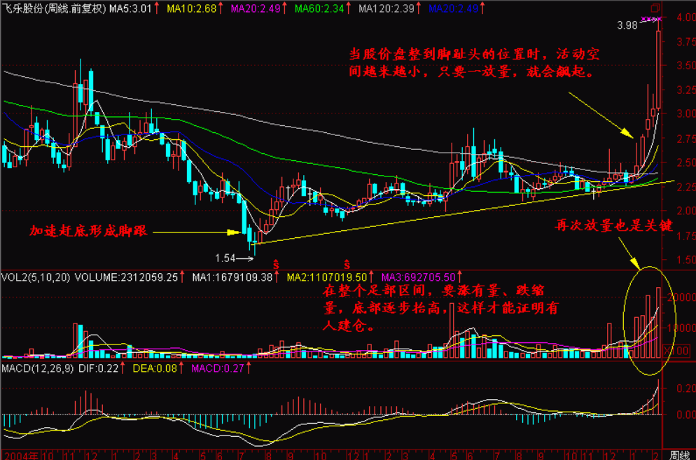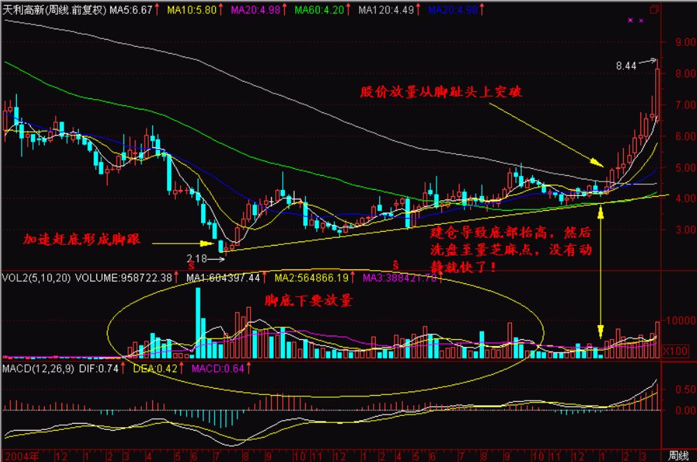 量是关键点,量缩放要有规律,除了脚底要有量,还有突破脚趾头时也要放量,还有一个关键点就是股价盘整到脚趾头那个位置时必须各种中短期均线几乎收敛在一起,那才是最有力的脚趾头,只要有量的配合就容易飙升!