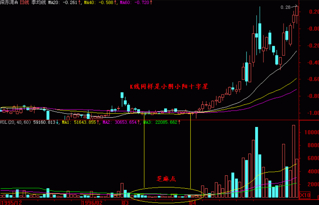 (2)日K线图同样出现小阴小阳或十字星,远远望去也是点点芝麻,这一带很可能存在机会。