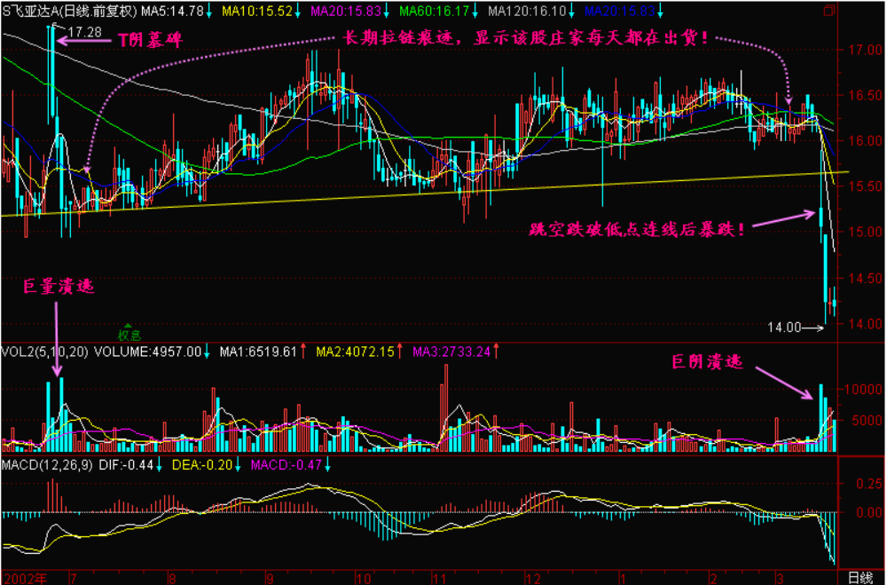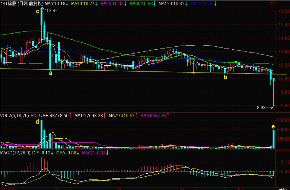 因为股价长期不跌,一直维持在ab线的上面,只是一种暂时的稳定状态。一旦被打破,就有暴跌的可能。图中跌势刚刚开始,昨天的阴线把头从ab线伸出来了,今天一路出货,放出了巨大的阴量(图中e),收盘的时候又收上去了,真是欲罢不能啊。还想抢救,但是又要出货,充分地暴露了庄家的矛盾心态。