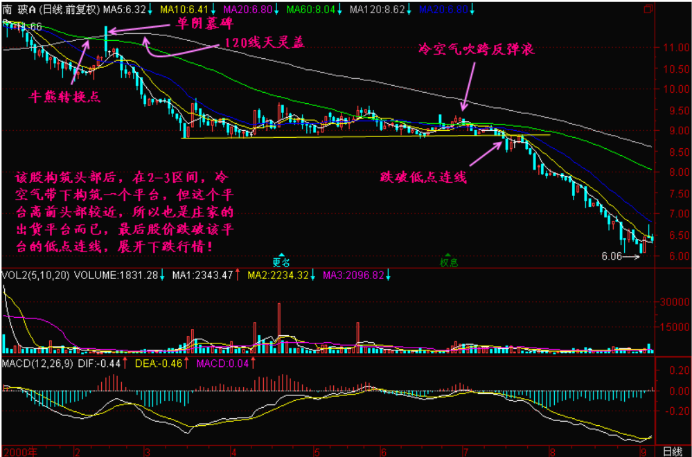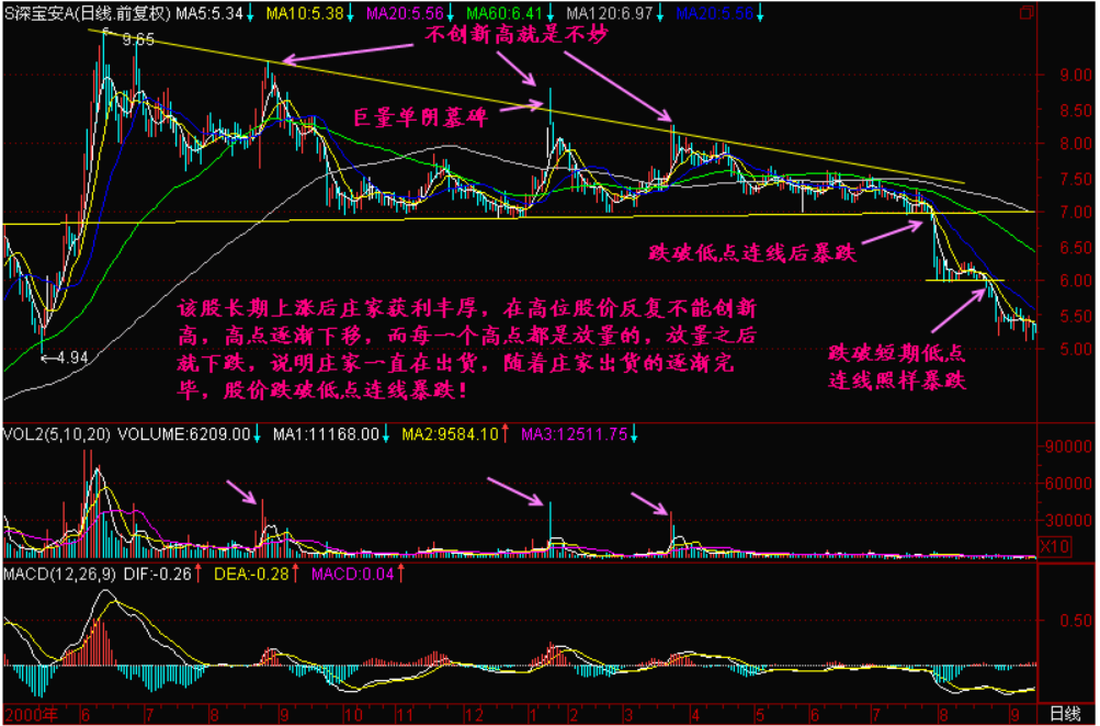 至此我们就看出了庄家的真实用意:尽量长地维持出货时间,尽量高地维持出货空间,想把货全部倒出去,获得最大的坐庄利益。对于一个庄家都要出货的个股,我们就要时刻准备跑,这是不会错的。