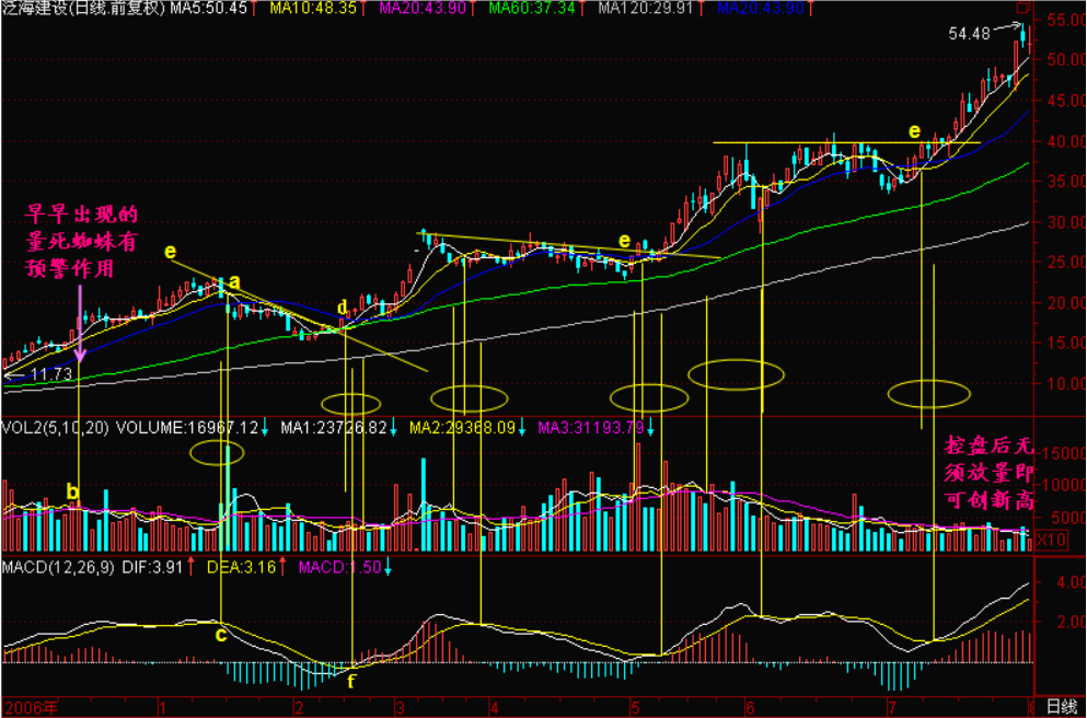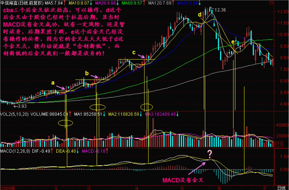 广通技术中有一个著名技术叫【后金叉买入】。它讲的是什么呢?它讲的是,如果你在三死叉的时候出货了:如图a点是一个5日、10日均价线死亡交叉,b点是5日、10日、20日均量线死蜘蛛,c点是MACD死亡交叉,这就构筑了【三死叉见顶】的信号,这足以使我们感觉不妙,先退出来再说。退出来以后,我们就等待出现比较明显、大级别的5日、10日均价线金叉(图d点),MACD金叉(图f点)和成交量5日、10日均量线金叉,也就是等待【三金叉见底】信号。对于一般的股票来说,三金叉出现意味着股价出现一个低点,起码也是阶段性或短期的低点,而对于庄股来说,如果三金叉不买进就等于踏空。