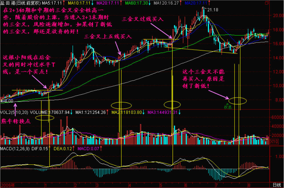 三:后三金叉更稳定,价金叉、量金叉、MACD金叉同时或相继发生的后金叉更好;