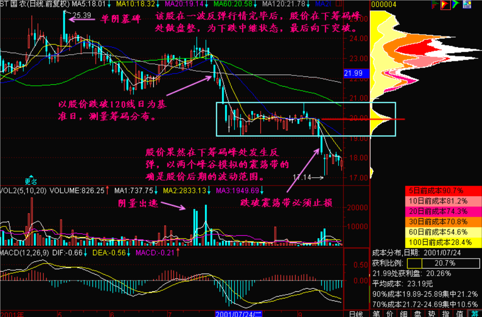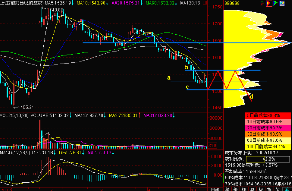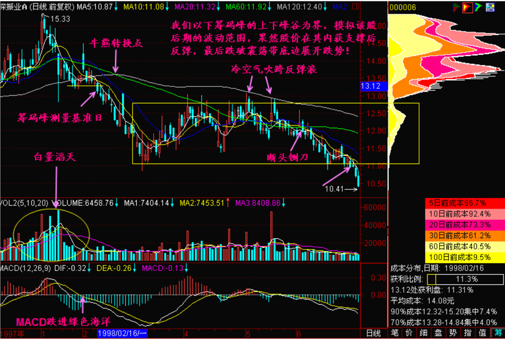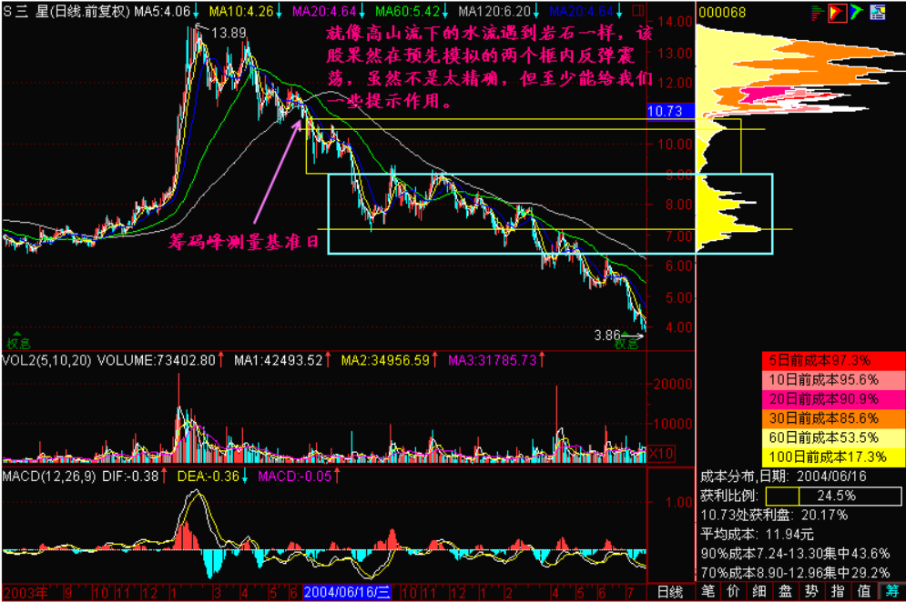 第二个问题,反弹浪的低点和高点在哪里?我们知道,指数或股价围绕着筹码峰上下震荡这是没问题的。那么低点在哪里?高点在哪里呢?我们一般把它表示为,筹码峰上下两侧的两个山谷。如果将筹码峰比喻为山峰,那么两峰之间就叫山谷。下面我们用字母来标注一下:a表示为筹码峰,b是筹码峰上侧的震荡边带,或者叫“筹码峰上边带”,c称为“筹码峰下边带”,这样就变成了以a为轴心的一个震荡区间带。研究震荡的幅度,或者说震荡低点和高点有什么意义呢?意义就是我们在震荡低点不要乱抛,反弹随时随地都可能发生;而在它的震荡高点,一定要逢高出货。以前我们常听说【逢高卖出、逢低买入】,这个高低没有给出数值,不能给它量化,而我们现在就可以给它量化,就是以筹码峰上方一个山谷和筹码峰下方一个山谷的高低点震荡。这样逢高派发就没有问题了,再往上涨就是多余的涨,碰上了好运气,或者说反弹到了上边带b线附近,要脑子清醒,时刻准备抛,时刻小心为妙。那么震荡低点是不是要买入呢?不一定,因为它是一轮滚滚跌势,抢这样的反弹是相当困难的。为什么相当困难呢?一是它的反弹高度有限,如果不是抢到强势股,连手续费都赚不来。二是它不一定反弹那么高,可能半途夭折了。从下边带c线到a中轴线的反弹夭折了,就直接往下跑,遇到一个夭折的反弹,使你更没办法操作。