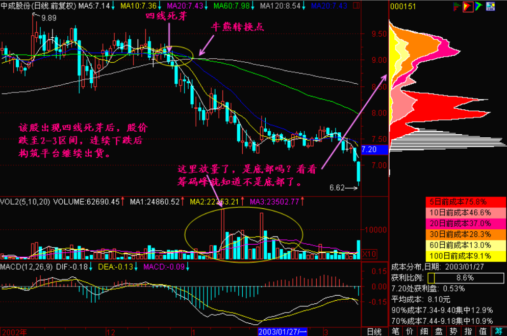 小结:死芽是暴跌的先兆,为什么呢?因为死芽形成时,所有长短均线周期内买入的投资者成本趋于一致,一旦股价开始微微向下跌,就会导致所有周期内的投资者都有被套牢的感觉,这个时候比较容易引起恐慌而竞相杀跌出局,这就是死芽形成后容易暴跌的原因了!