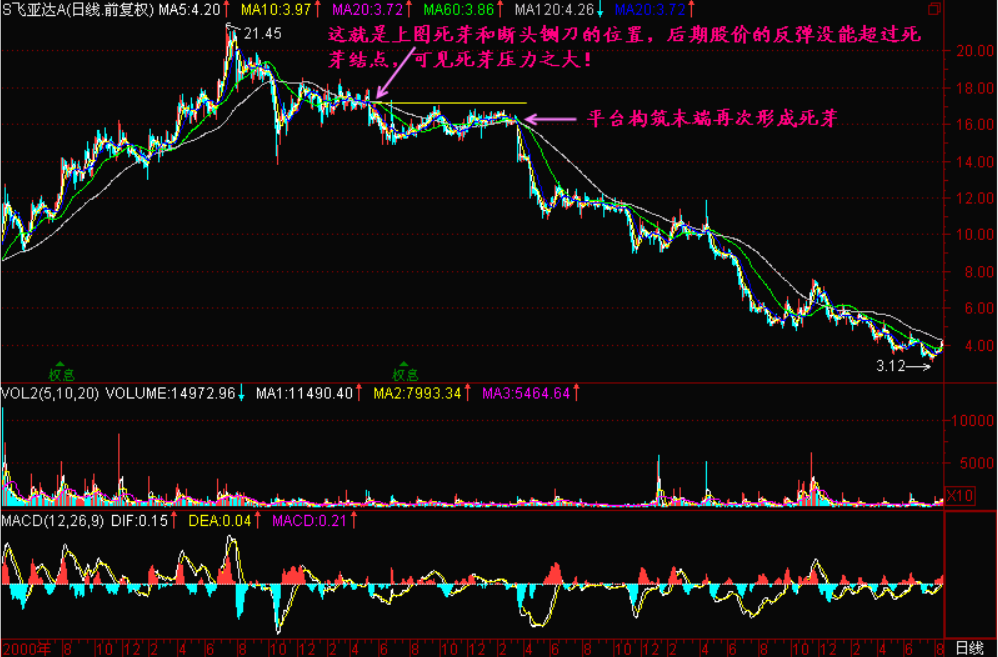 【死芽】刚开始时并不引人注目,人们对这种K线横向震荡走势往往放松警惕,习以为常。只有等到暴跌发生以后才想起来,哇,这里有一个【死芽】!