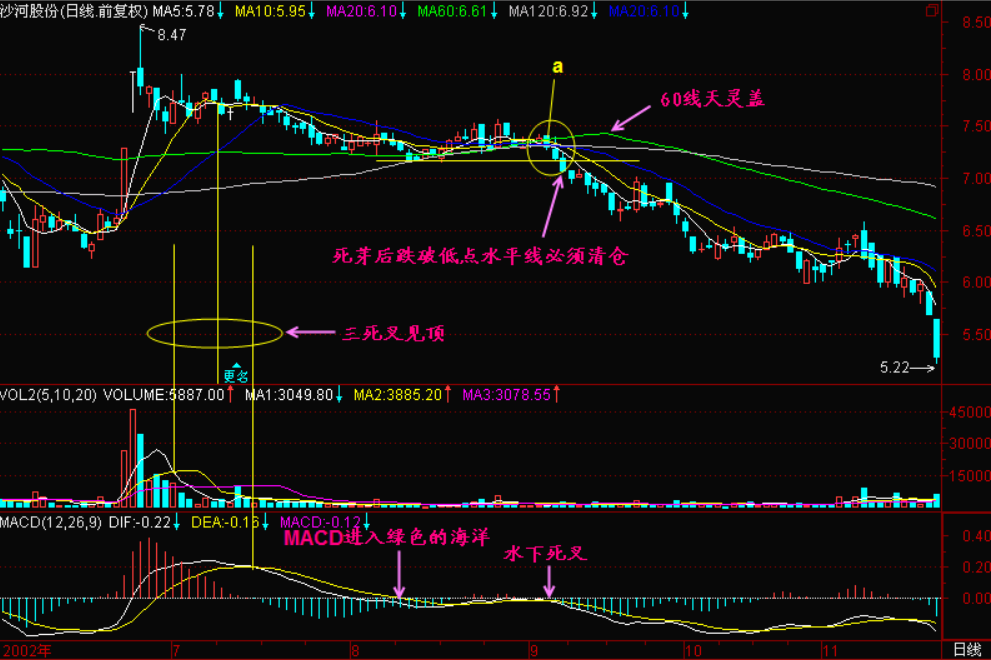 在【死芽】发生以后,我们还可以借助其它相关头部信号来确认跌势已经开始,比如前期头部区间的【三死叉见顶】,三死叉见顶已经是头部特征了,在它下面运行的【死芽】就是下跌行情已经开始的信号!还有头部区间的低点连线、MACD进入绿色的海洋、水下死叉等等……