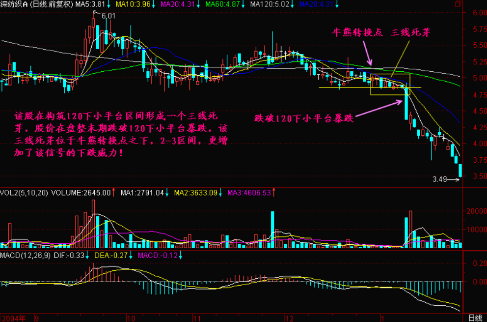 我们比较常见的是【三线死芽】、【四线死芽】,如果形成了【五线死芽】,那就是一轮大的跌势的开端,而三线死芽一般最容易出现在2-3区间,每当2-3区间形成三线死芽后,股价就容易形成短线暴跌的局面。