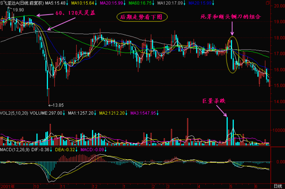 还有一种【死芽】比较典型,那就是当所有均线密集收敛在一起之后,突然出现一根高开低走的【断头铡刀】切断所有的均线,这就更加肯定了跌势的形成!