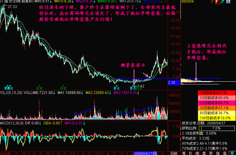 筹码峰的转移就是庄家运作股票的全过程,对于一个头上还有筹码峰没有割肉下来、股价还在2-3区间创新低的股票,绝不是我们要关注的目标,必须得等到股价头上的筹码峰割肉完毕,底量超顶量,后量超前量,低位单峰密集、底部抬高了,我们就多留意,只要股价在2+3区间站稳后再度向上突破时,就是我们关注的区间了。