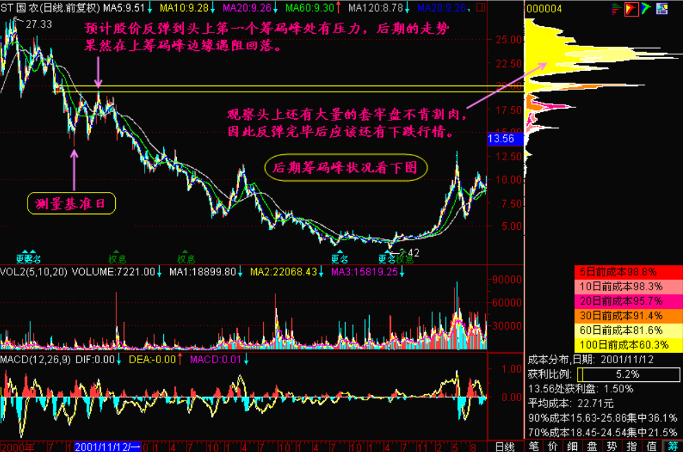 在这里请首先注意一个“测量基准日”的问题,就是在测量筹码分布时,必须选择一个相对低点或高点来测量当时的筹码分布状况,这个点位的选择一般以波段低点或高点为选取对象。