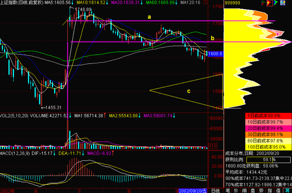 有同学又问,哪一天会涨呢?像这样的话,不就永远涨不上去了吗?b线永远不能冲过了吗?不是的。目前的位置不能反弹上去,是因为上面的人还没有割肉,怎么办呢?市场会做出调节的。市场调节包括两个方面,一个是空间调节,一个是时间调节。只要有充分的时间下跌,时间长度达到了,成交量会越来越往下挪,下面的筹码峰就会长大,因为上面的筹码都转移到下面来成交了。在下面重新形成筹码堆积,可能在三角形一带形成一个巨大的筹码峰,伴随着上面筹码峰减小。也就是说,随着时间的推移,成交量慢慢地下移,上档的人到下边来成交,割肉了,上面的筹码峰就转移到下面来了。