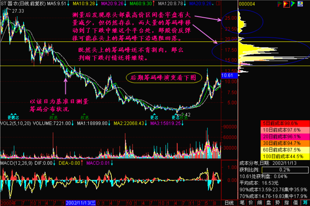 因此,要使筹码峰从高位转移到下面,需要两个条件,第一:要有一定的下跌时间;第二:要有一定的下跌空间。图中的指数正处于反弹结束,下跌中继,必须跌出时间、空间的过程里。