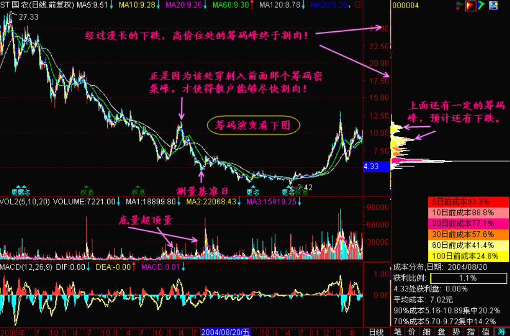 小结:经过上面的演示,我们知道,一只股票一旦形成头部下跌后,顶部会有大量的套牢盘,而要想发动新的行情,就要这些套牢盘到低位来割肉,想要套牢盘割肉,则必须下跌一定的空间,和持续一定的时间,否则散户是不肯割肉的,庄家只有制造一次又一次的反弹后再度下跌并创新低的行情,来刺激散户的神经,最后还来个加速赶底,让散户在最后的绝望中割肉离场,只有这样才能完成筹码从高位的散户手中向低位的庄家口袋转移的过程。