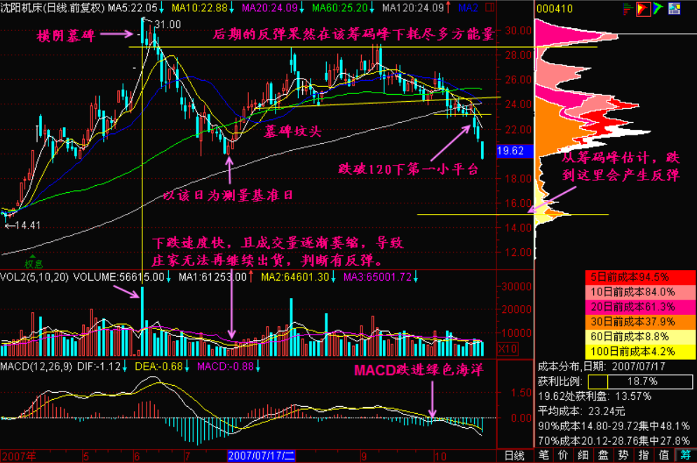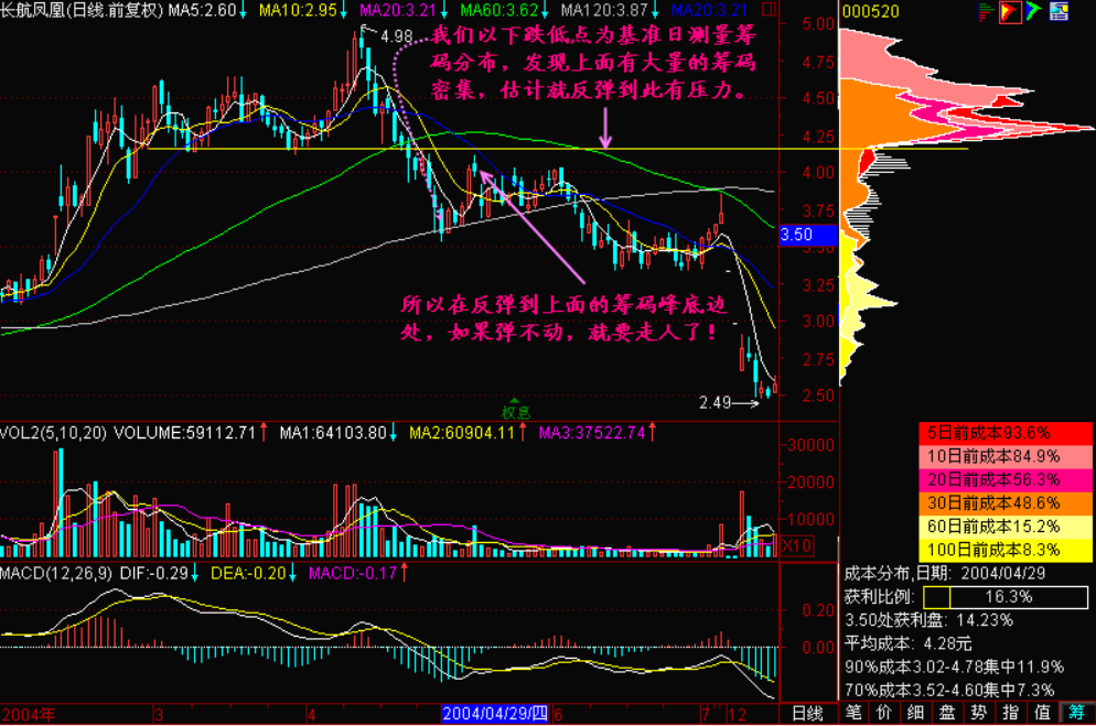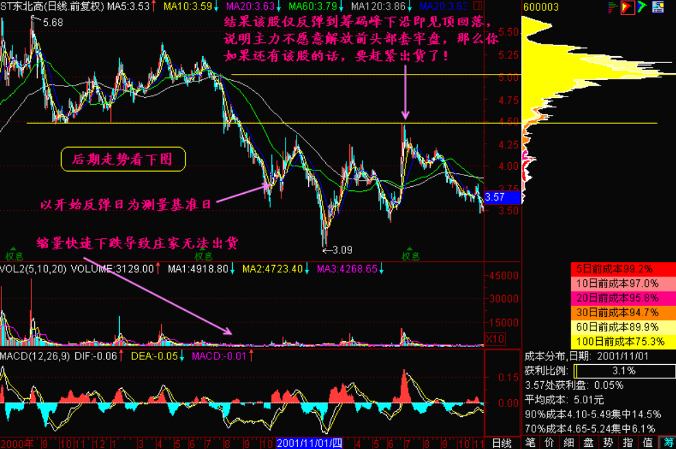 小结:股价一旦筑顶后进入下跌通道,任何的反弹均是出货良机,一般股价反弹到前头部筹码峰下沿处就会遇到压力,压力来自于前头部套牢盘,只要股价在筹码峰下反弹乏力,就要出货了。如果此时你还抱有幻想的话,那当股价跌到5线之下总该及时醒悟了吧?如果错过最后清仓的末班车,就将参与漫长的下跌行情!