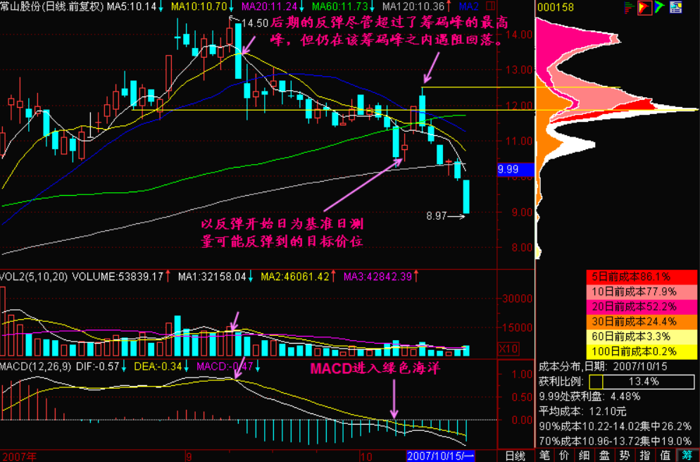 我们知道,股价下跌到最近的筹码峰时就有可能发生反弹,它会反弹到上面的第一个筹码峰,当股价反弹到上面的筹码峰时,能量就容易被消耗掉,它就会慢慢减速运行。如果股价再打上去的话,筹码峰里面的套牢盘就要解套,因此再反弹上去会很乏力。