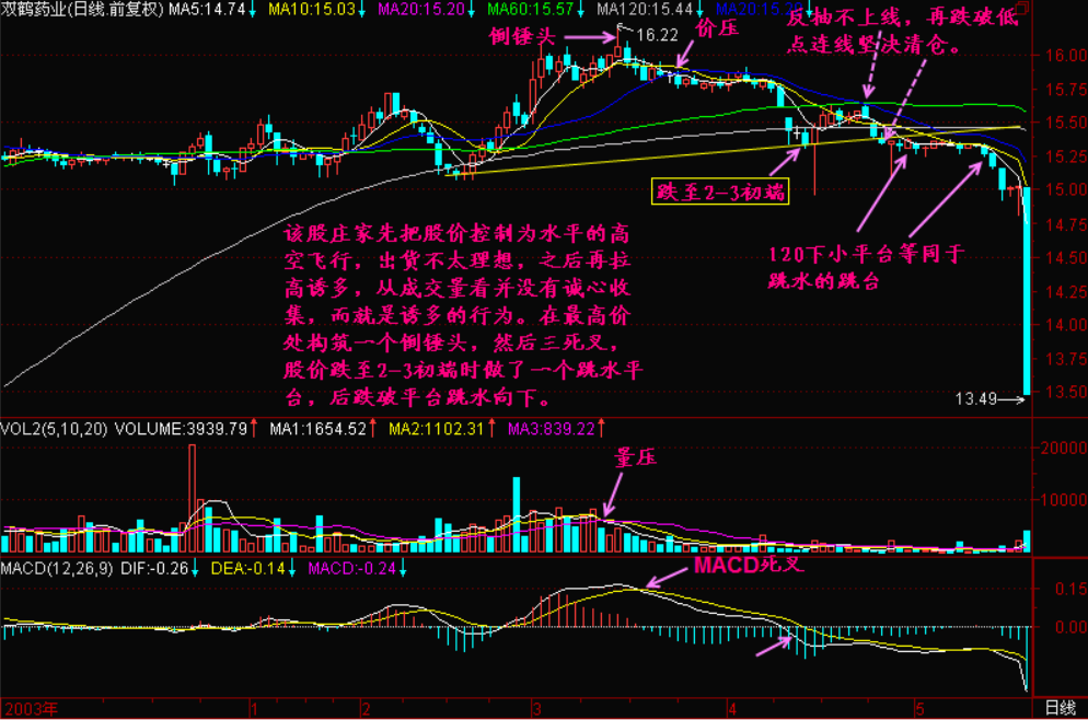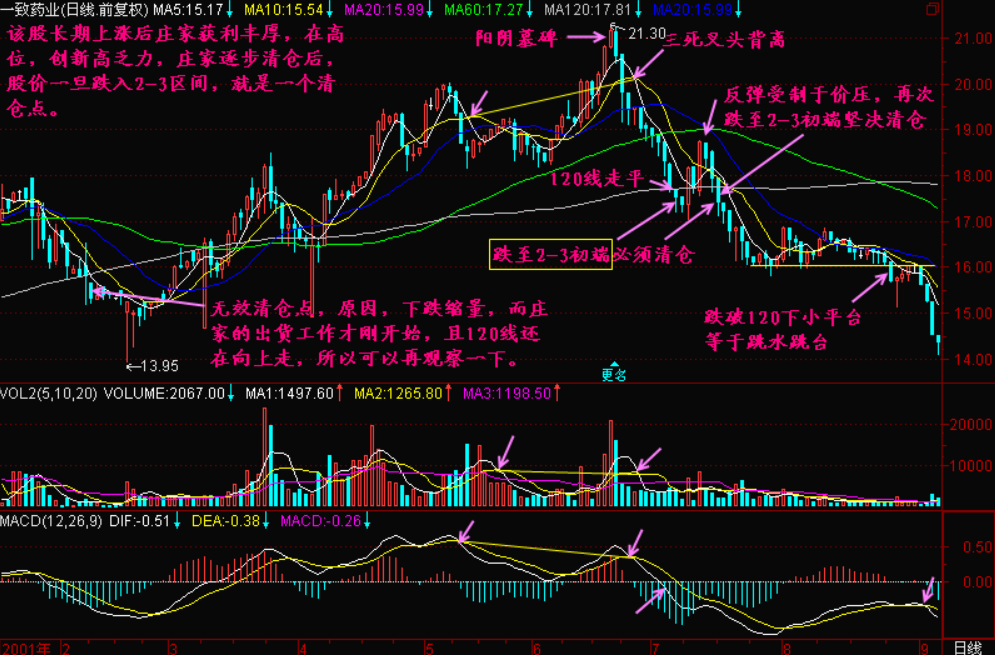 在股价经历了“2+3末端”和“上升2&3末端”后,如果庄家清仓基本完毕,则股价极容易跌至“2-3初端”,而2-3区间是不能操作区,所以跌至2-3初端等于清仓的信号,这点务必要牢记!