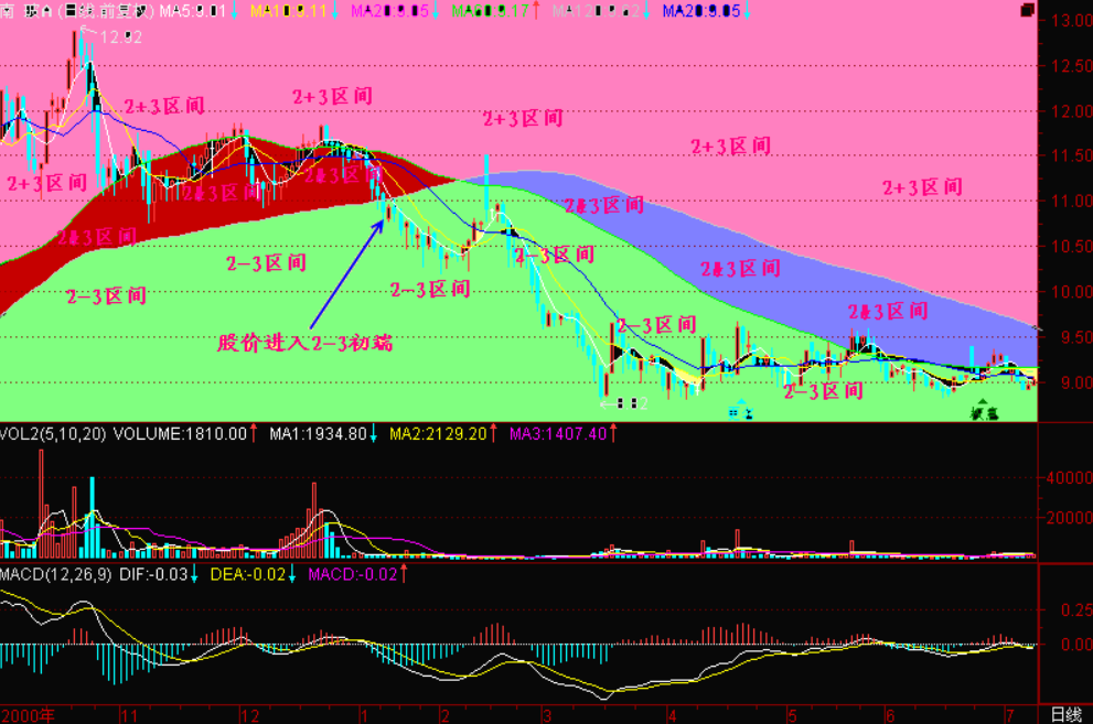 股价在“上升2&3末端”内的上下盘整,是庄家为了拖延出货时间而设计的,当庄家基本出货完毕后,不再照顾股价,此时股价很容易跌入到“2-3初端”,而股价一旦跌入“2-3初端”,就是持币的开始了,任何试图抢反弹的操作都是徒劳的,很容易再被套住。