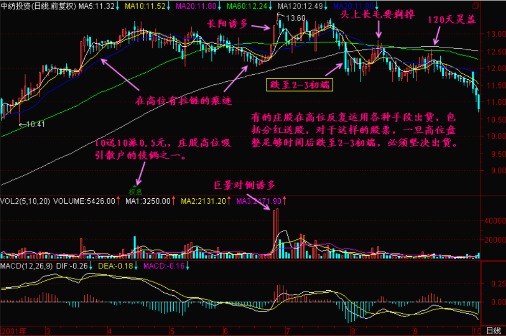 广通有很多指导我们操作的名言,比如本节也可以把股价跌至“2-3初端”的情况表述为“跌破五线没底了”,意即下跌空间较大,风险较大的意思。头上有五根均线压迫着,股价向下运动则比较容易。
