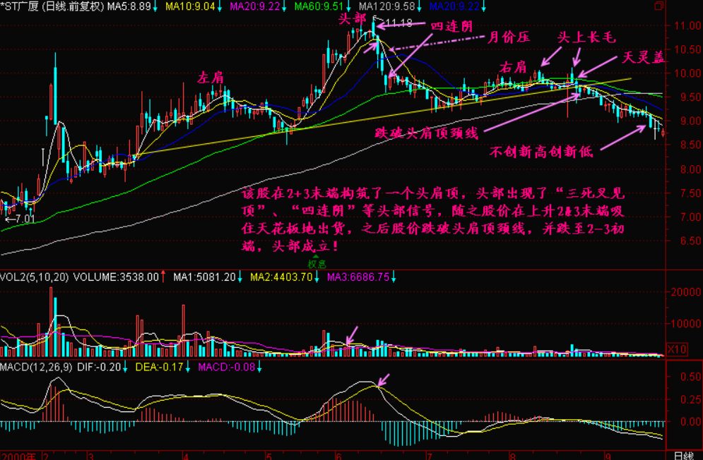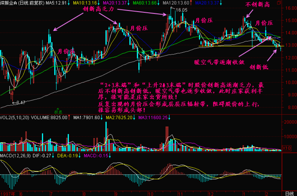 小结:本节讲述了股价在“2+3末端”、“上升2&3末端”的一些头部特征,比如创新高逐渐乏力,股价头部K线组合频繁出现,反复出现的价压会形成众多的压辐射带阻碍股价上升,不创新高创新低等等……