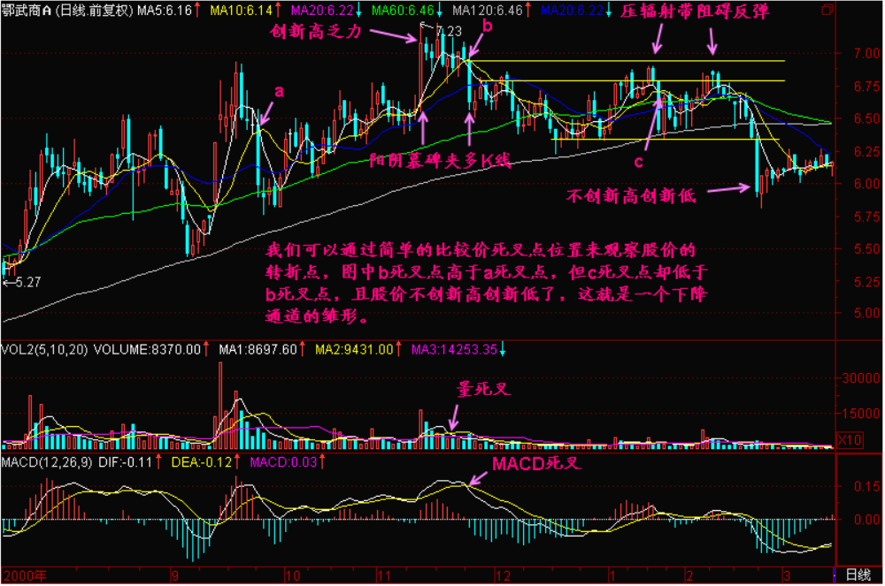 我们还可以通过观察5日均线和10日均线的每一个死叉点的位置,来判断股价创新高的能力,只要后面的死叉能够高于前面的死叉,那么可以认为升势还在延续,而一旦后面的死叉点位置低于前面的死叉点位置,而股价不创新高创新低,那么就是下降通道的雏形了。