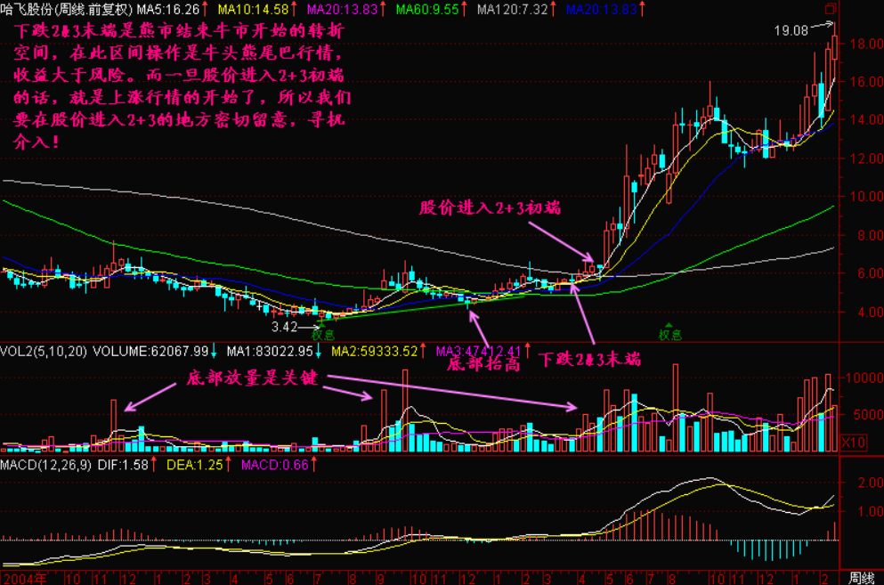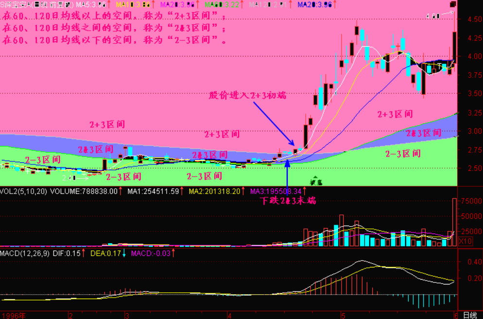 它指的是两条中期平均线在运行的时候,它的运行速度比较慢,而三条短期平均线运行速度较快,当三条短期(快速)平均线向上通过两条中期(慢速)平均线的时候,我们就把60日、120日两条慢速平均线以上的空间称作“2+3区间”。或者简单地说,在60日、120日均线上方的股价空间,称为“2+3”区间。指数反转行情发生在这个区间,牛股的大部分上升段也是在这里展开的,在这里操作是做反转行情。