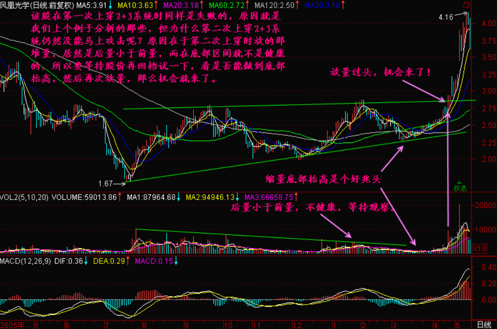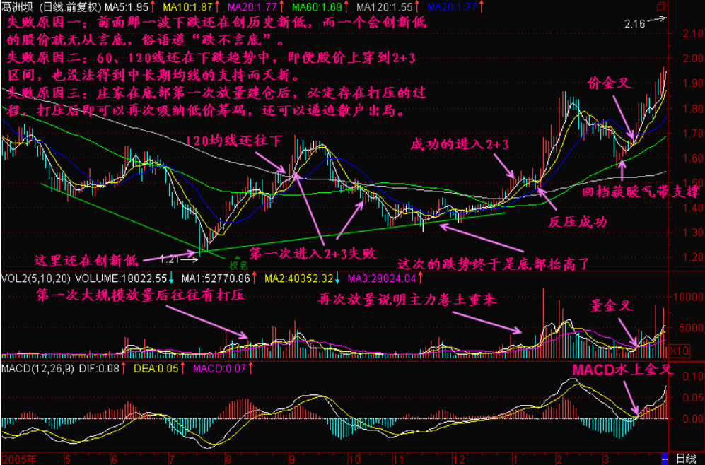 下面这支股票在股价第一次进入2+3区间时为什么失败了?为什么第二次进入2+3区间的时候就成功了呢?